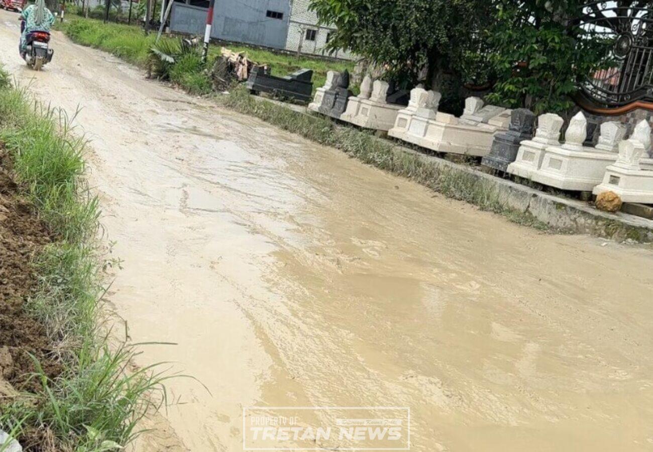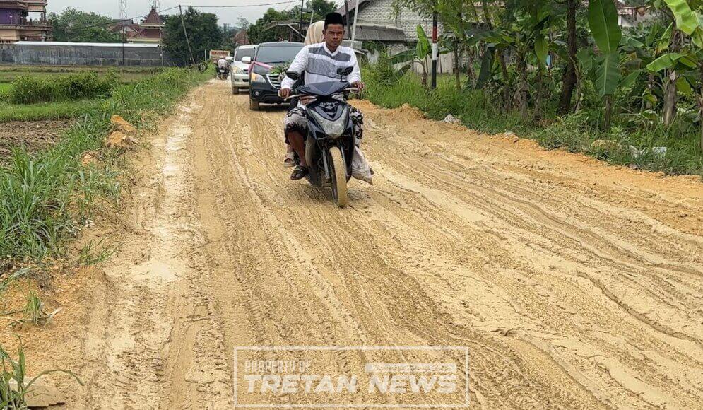 Pantauan Tretan.news di lapangan, Kamis (13/11/2025), memperlihatkan badan jalan penuh genangan lumpur dan berlubang di sejumlah titik. Saat turun hujan, jalan berubah seperti kubangan sawah, membuat pengendara roda dua maupun roda empat kesulitan melintas.