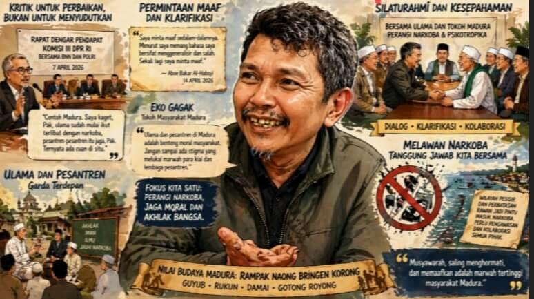“Ulama dan pesantren di Madura selama ini justru menjadi benteng moral masyarakat dalam memerangi narkoba. Jangan sampai muncul stigma yang melukai marwah para kiai dan lembaga pesantren hanya karena pernyataan yang bersifat umum,” kata Eko Gagak.