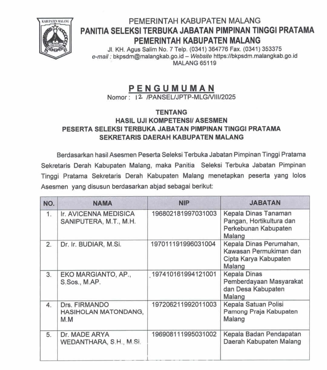 Sebagai informasi, berdasarkan surat pengumuman hasil uji kompetensi / asesmen peserta Selter Calon JPTP Sekretaris Daerah (Sekda) Kabupaten Malang, terdapat lima peserta.