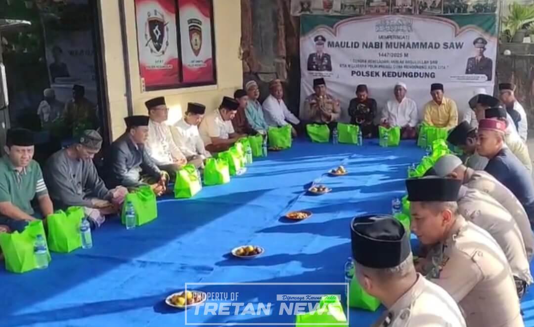 SAMPANG, Tretan.News – Momentum bersejarah tercipta di Polsek Kedungdung, Polres Sampang. Untuk pertama kalinya sejak berdiri, Polsek Kedungdung menggelar peringatan Maulid Nabi Muhammad SAW yang dirangkai dengan doa bersama masyarakat di Mako Polsek, Rabu (17/9/25) sore.