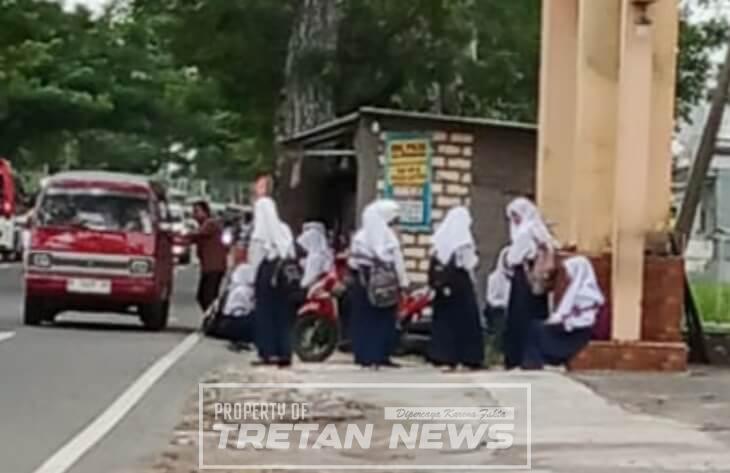 Sejumlah siswa terlihat telah meninggalkan sekolah dan berada di jalan raya menuju arah Trageh sejak pagi hari, masih mengenakan seragam sekolah serta membawa tas.