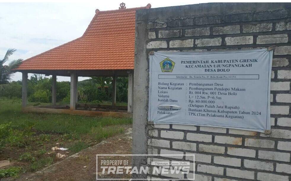 GRESIK, Tretan.News  — Pembangunan pendopo makam di Desa Bolo, Kecamatan Ujungpangkah, Kabupaten Gresik, menjadi sorotan warga. Proyek dengan nilai anggaran Rp80 juta tersebut menuai pertanyaan terkait status lahan dan proses perencanaannya, meski papan informasi proyek terpasang di lokasi.